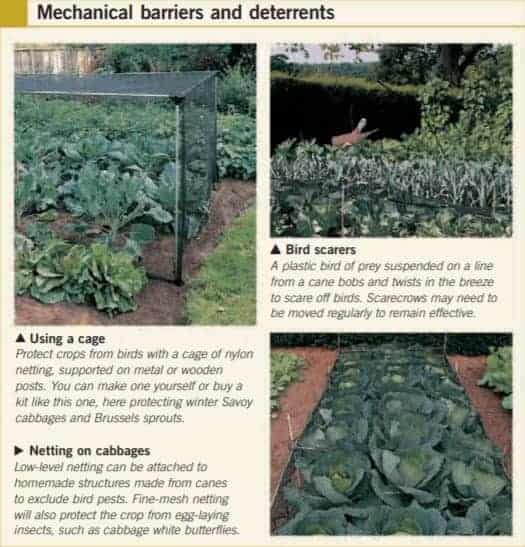 Plants can be effectively protected from birds, rabbits, and deer by netting or individual tree guards. Many insect pests can also be controlled by mechanical means: on a garden scale it is possible to remove caterpillars or slugs and snails by hand, or to squeeze clusters of aphids on shoot tips.