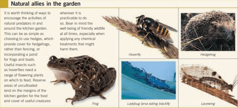 Plants also emit scents that attract predators or parasites of their attackers. In nature, diversity in a plant community minimizes the effects of pests and diseases; in a kitchen garden, we tend to grow blocks of a single crop, advertising its existence and increasing the chances of attack. Keeping the area weed-free also reduces the habitat for beneficial predators and parasites.