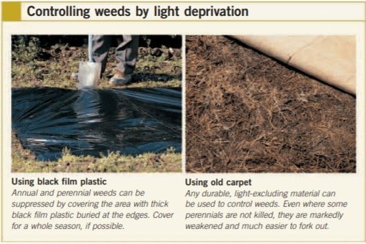 Nonwoody perennials can be controlled by long-term covering with heavy-gauge black film plastic or other durable, light-excluding material such as old carpet. To be most effective it will need to be in place for at least a whole growing season, so forward planning is essential.